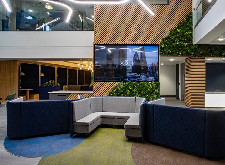 The building features a modern, clean style, with lots of informal gathering spaces for ad-hoc meetings and coffee breaks: